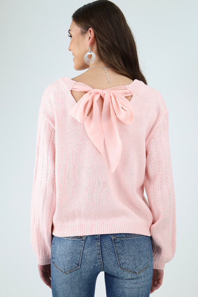 Add a playful twist to your sweater collection with this Tie Back Sweater, boasting a flirtatious deep V back and charming cable knit sleeve details, making it a stylish and fun addition to your cold-weather wardrobe.
